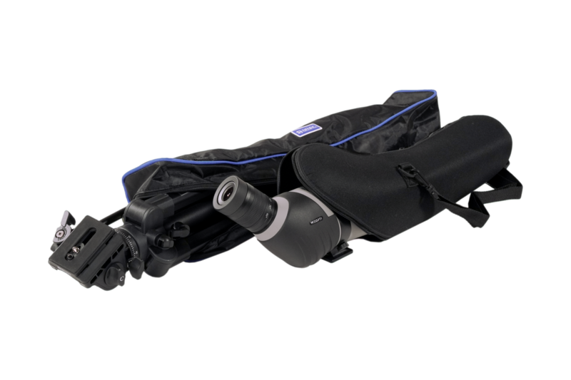 I kombination med stativet från Benro som har en bekväm arbetshöjd från 62 till 169 cm, gummerade fötter, och som klarar en tubkikare (eller kamera/videokamera) upp till 5 kg. En krok i nedre änden av mittpelaren gör att man kan hänga något tungt för att tynga ner stativet så det står stadig även i kraftig vind.